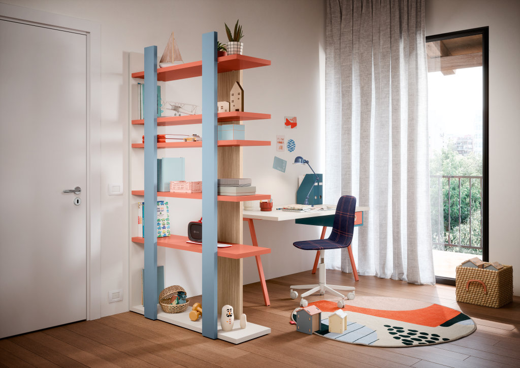 Questa soluzione funziona particolarmente bene nelle camerette irregolari o in quelle con nicchie e rientranze. La libreria abbraccia l’architettura esistente, trasformando vincoli in punti di forza: l’angolo diventa il fulcro visivo della composizione, dove si concentrano colori e volumi più dinamici.
