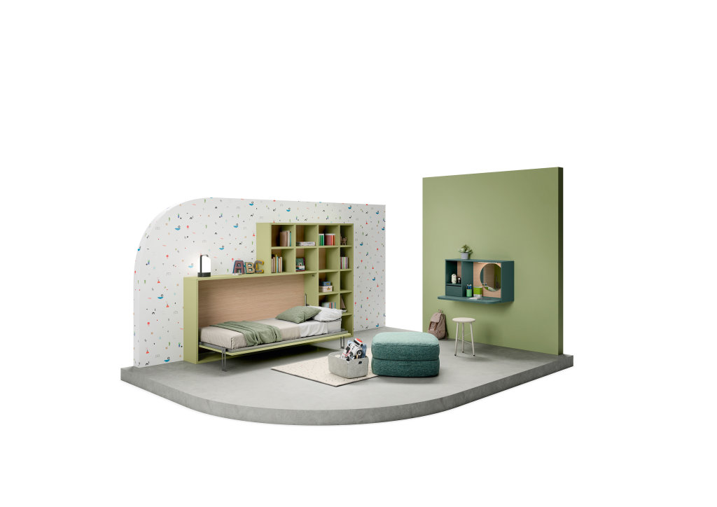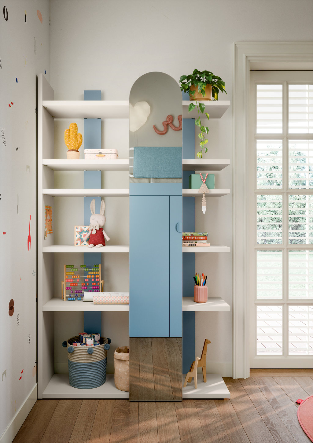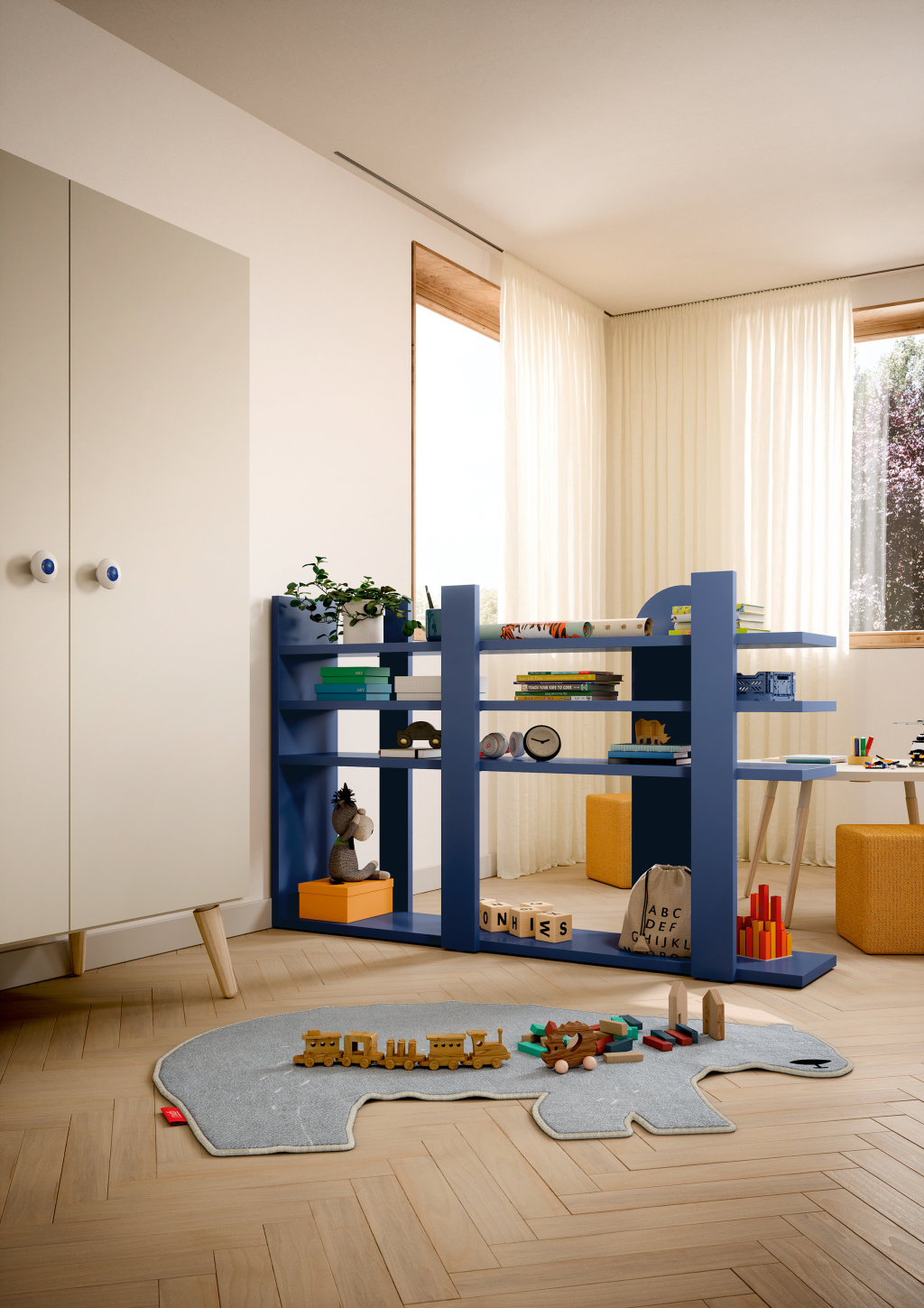 Holly unisce contenimento e versatilità in un unico progetto e introduce elementi strutturati: vani attrezzati con schienali colorati, moduli angolari, soluzioni a ponte che sfruttano l’altezza delle pareti. È la risposta ideale per chi cerca una libreria che organizzi non solo libri, ma l’intera cameretta. Il sistema permette diverse configurazioni: librerie che diventano pareti attrezzate, angoli studio integrati con mensole e contenitori, passaggi sopra il letto che liberano superficie a terra. Ogni modulo dialoga con gli altri, costruendo un ambiente coerente dove ogni funzione trova il proprio spazio senza sovrapposizioni.