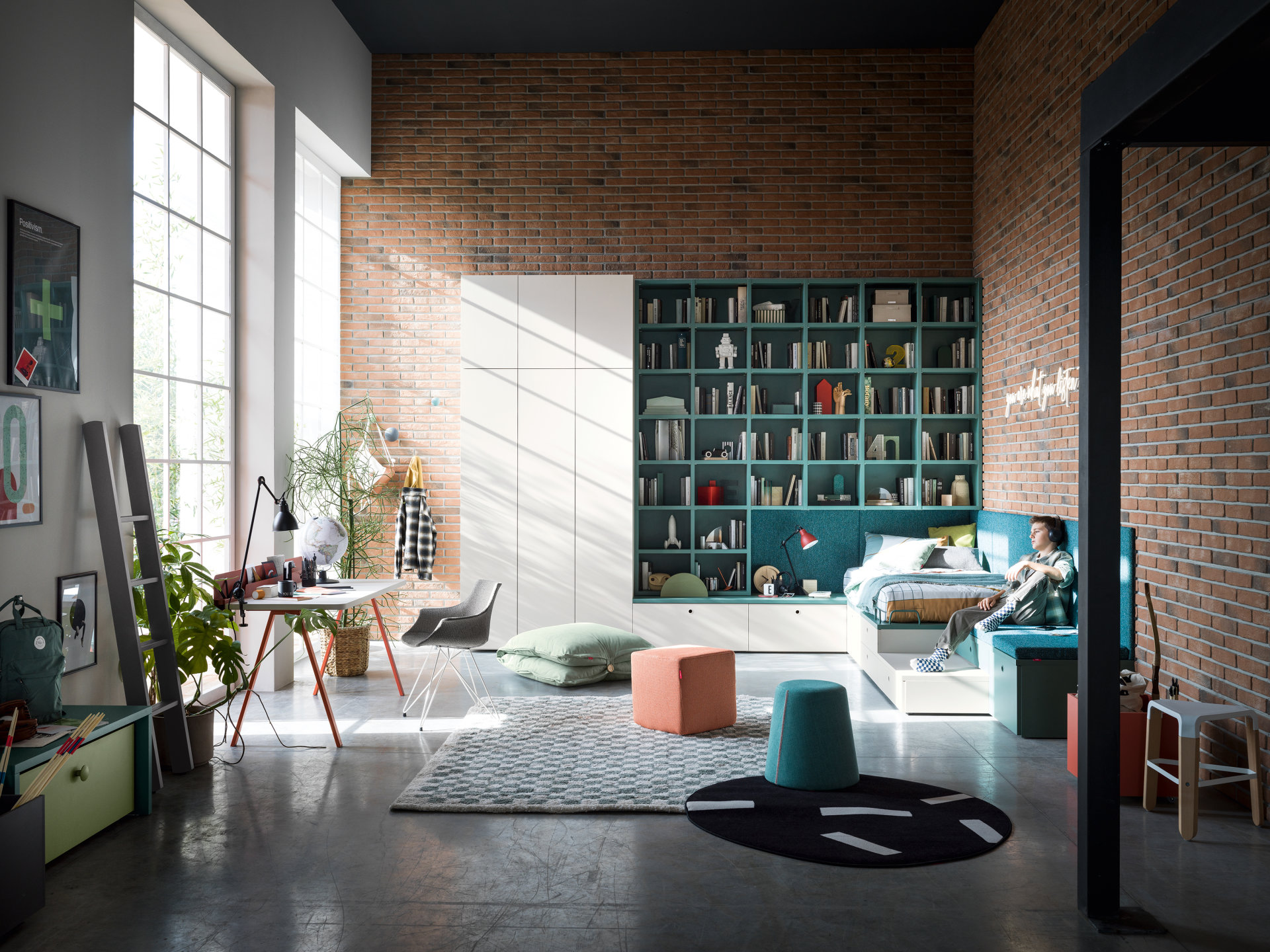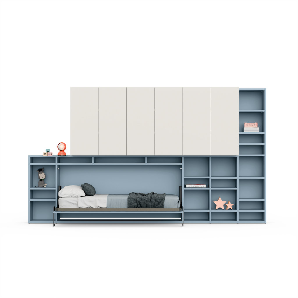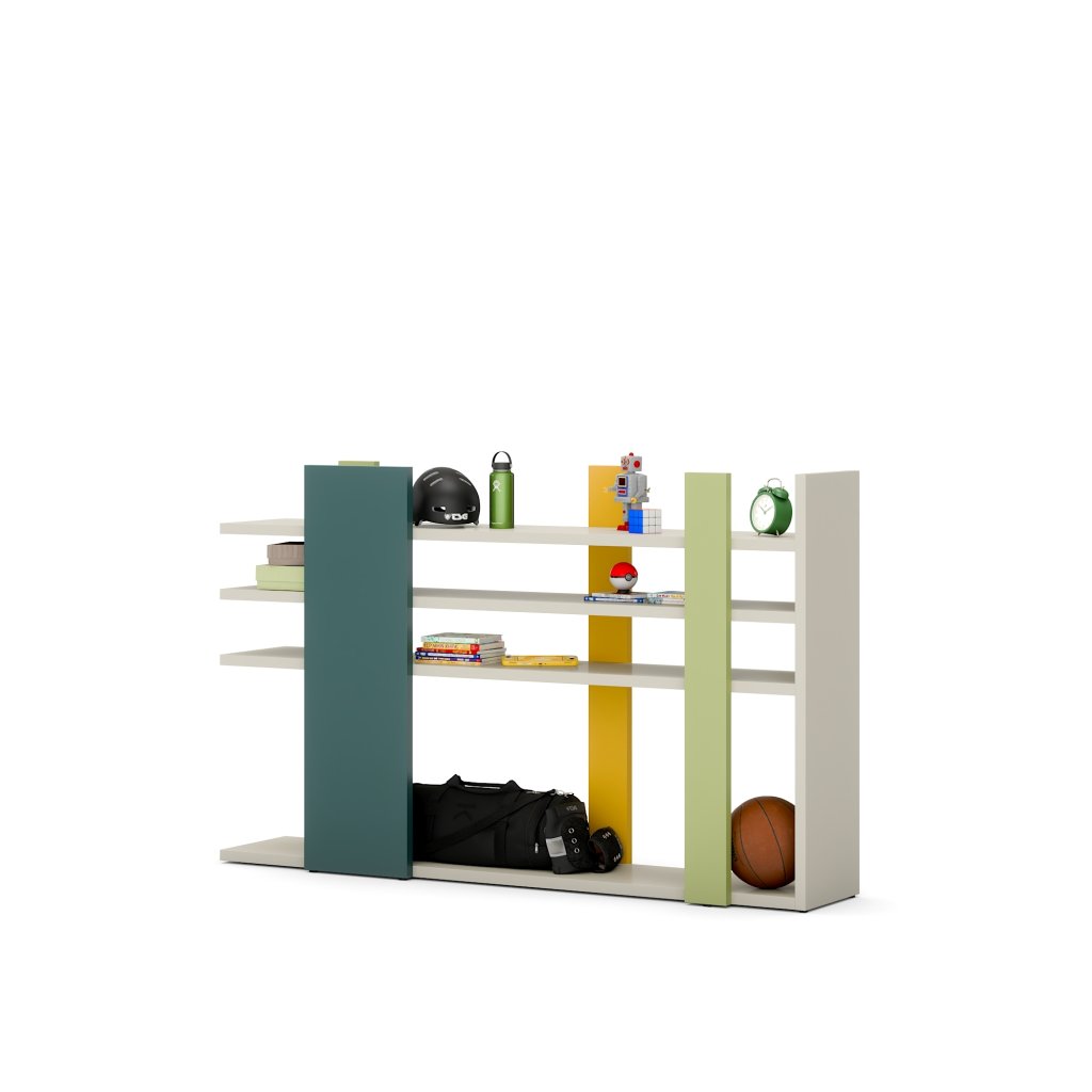 Holly unisce contenimento e versatilità in un unico progetto e introduce elementi strutturati: vani attrezzati con schienali colorati, moduli angolari, soluzioni a ponte che sfruttano l’altezza delle pareti. È la risposta ideale per chi cerca una libreria che organizzi non solo libri, ma l’intera cameretta. Il sistema permette diverse configurazioni: librerie che diventano pareti attrezzate, angoli studio integrati con mensole e contenitori, passaggi sopra il letto che liberano superficie a terra. Ogni modulo dialoga con gli altri, costruendo un ambiente coerente dove ogni funzione trova il proprio spazio senza sovrapposizioni.