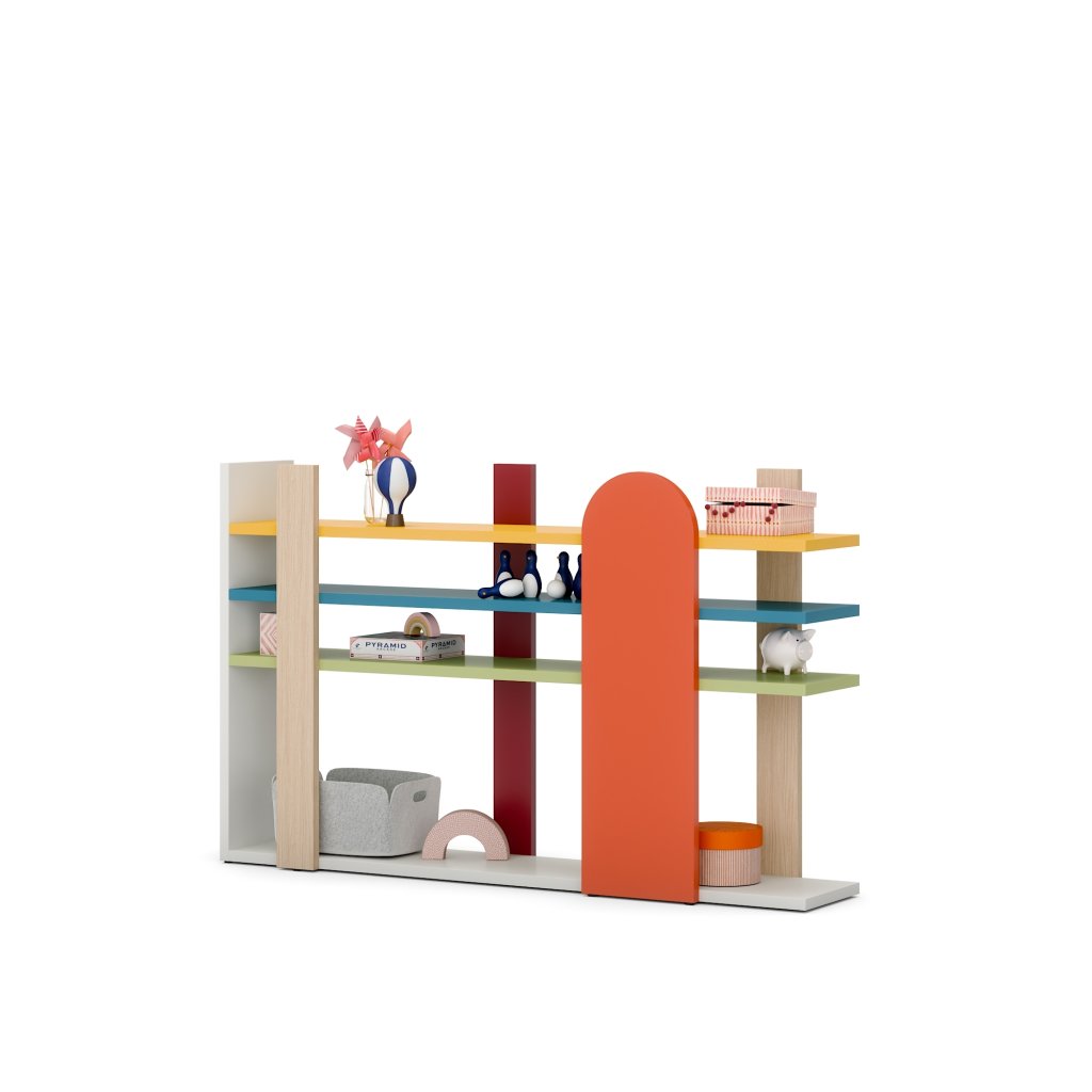 Surfy è una libreria grafica: mensole sospese che creano ritmo sulla parete, moduli sottili che occupano poco volume, finiture morbide che riflettono la luce naturale. È pensata per camerette dove lo spazio va preservato, ma senza rinunciare a personalità e carattere. I ripiani hanno profondità ridotta rispetto ai sistemi tradizionali, perfetti per libri illustrati, fumetti, piccoli oggetti.