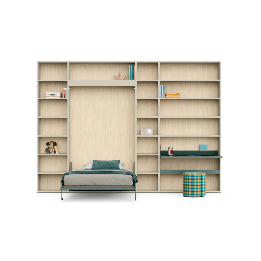 Quando lo spazio è limitato, le soluzioni salvaspazio diventano strategiche. Le librerie a ponte e le configurazioni integrate permettono di sfruttare altezze e volumi che altrimenti resterebbero inutilizzati, costruendo camerette funzionali anche in metrature ridotte.