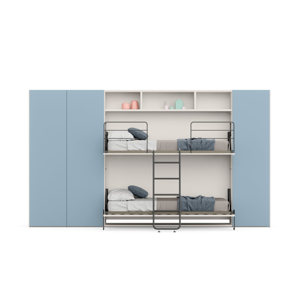L’altezza del ponte va calcolata con attenzione: deve permettere di alzarsi comodamente dal letto senza rischi, ma anche garantire accessibilità ai ripiani superiori. NIDI offre configurazioni standard testate ergonomicamente, con possibilità di personalizzazione per adattarsi a soffitti particolarmente alti o bassi.
