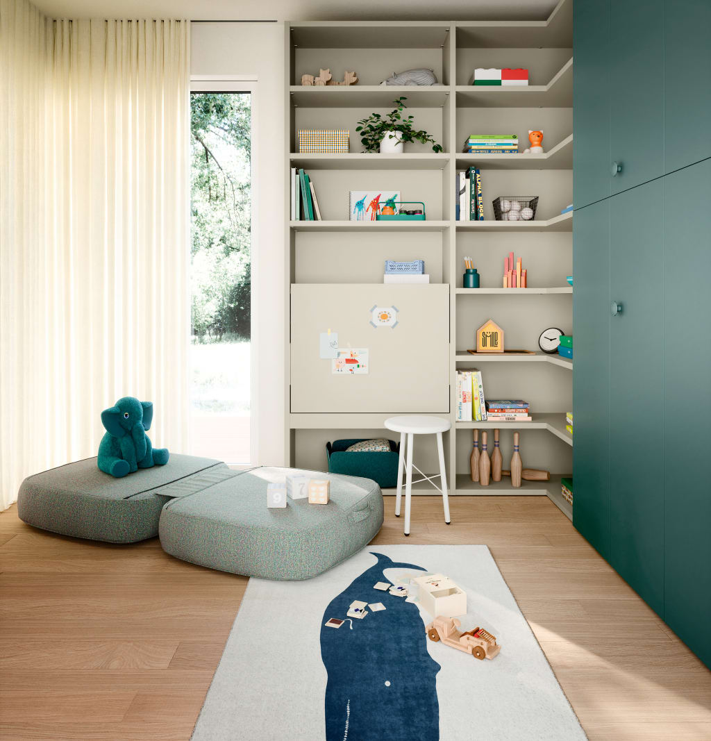 L’integrazione massima si ottiene quando libreria, letto e scrivania dialogano in un unico sistema coordinato. NIDI propone soluzioni dove la libreria si estende sopra la scrivania, prosegue lungo la parete e si collega al letto attraverso moduli contenitivi laterali. Questi sistemi integrati trasformano la cameretta in un ambiente organizzato per funzioni: zona notte, zona studio, zona gioco, ognuna con il proprio supporto contenitivo a portata di mano.