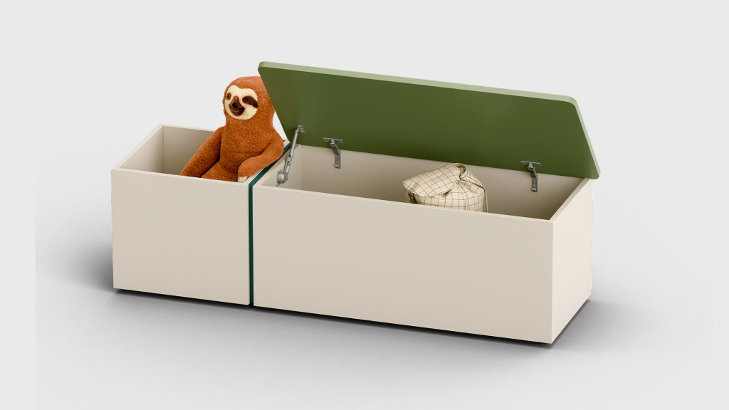 La versatilità di Pank è accentuata dalla possibilità di dotare il coperchio di un’imbottitura, trasformandola in una seduta extra estremamente comoda. Questa combinazione di contenimento e seduta rende la cassapanca un elemento multifunzionale indispensabile in ogni cameretta.