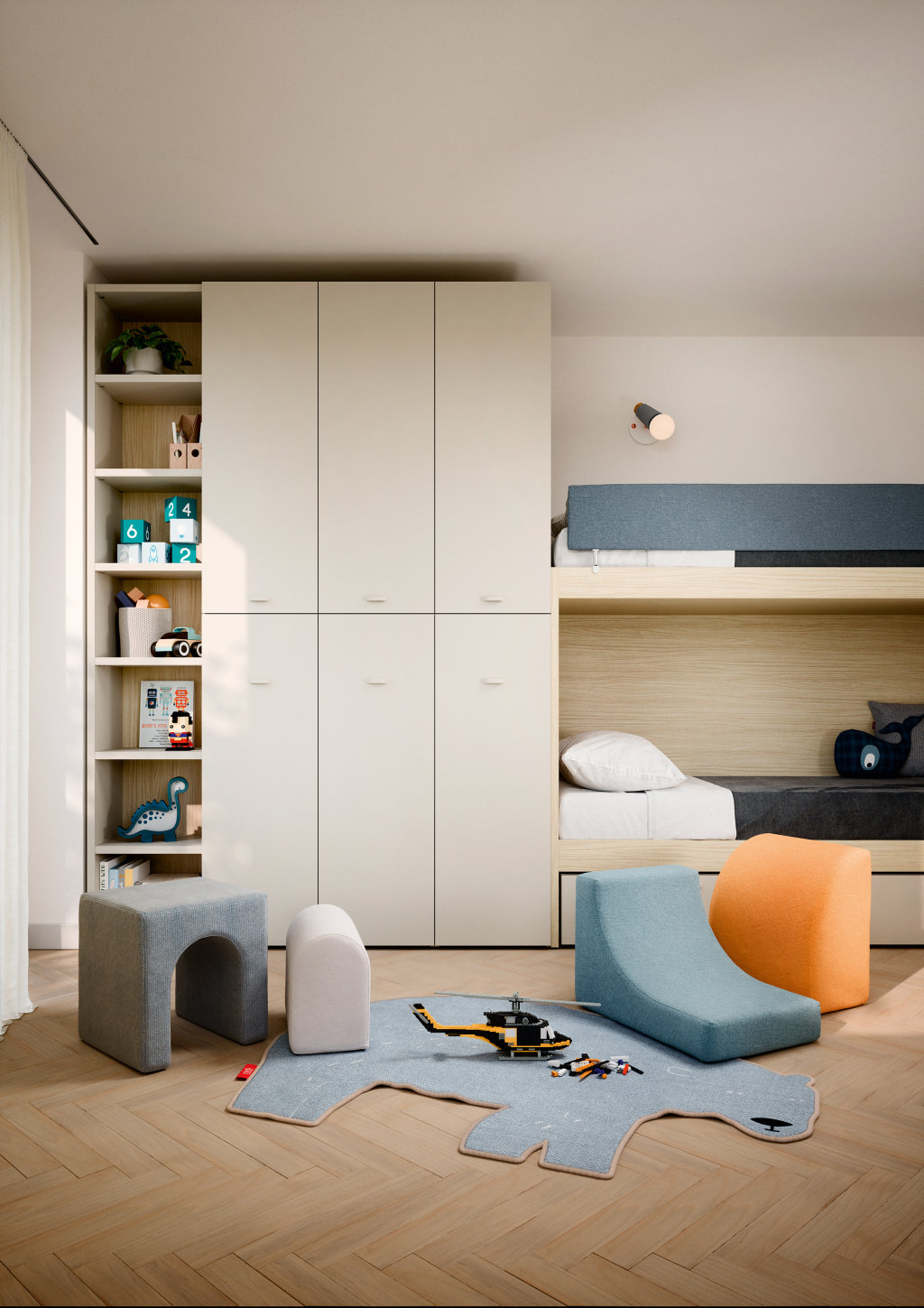 Ogni camera è immaginata come un racconto che si sviluppa nel tempo, dove i bambini possano sentirsi protagonisti. Per questo oltre ai mobili vengono proposti sistemi completi che includono complementi, imbottiti e accessori coordinati.