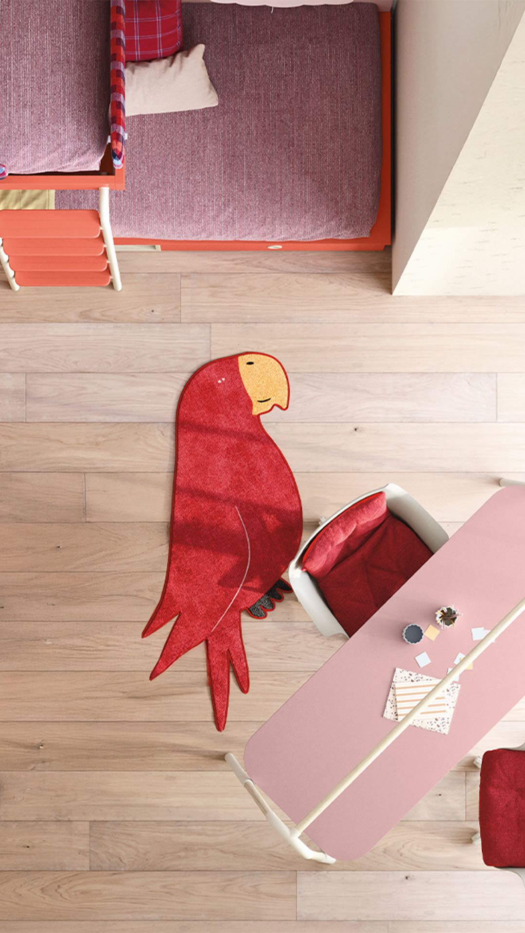 Il tappeto Parrot introduce una vibrante esplosione di colore nella cameretta di bambini e ragazzi, grazie alla sua inconfondibile forma di pappagallo. L’utilizzo di colori accesi è studiato per infondere allegria nell’ambiente, rendendo lo spazio subito più vivace e stimolante. Oltre a essere un elemento decorativo, il tappeto fornisce una base morbida e sicura, ideale per i momenti di relax o per il gioco.